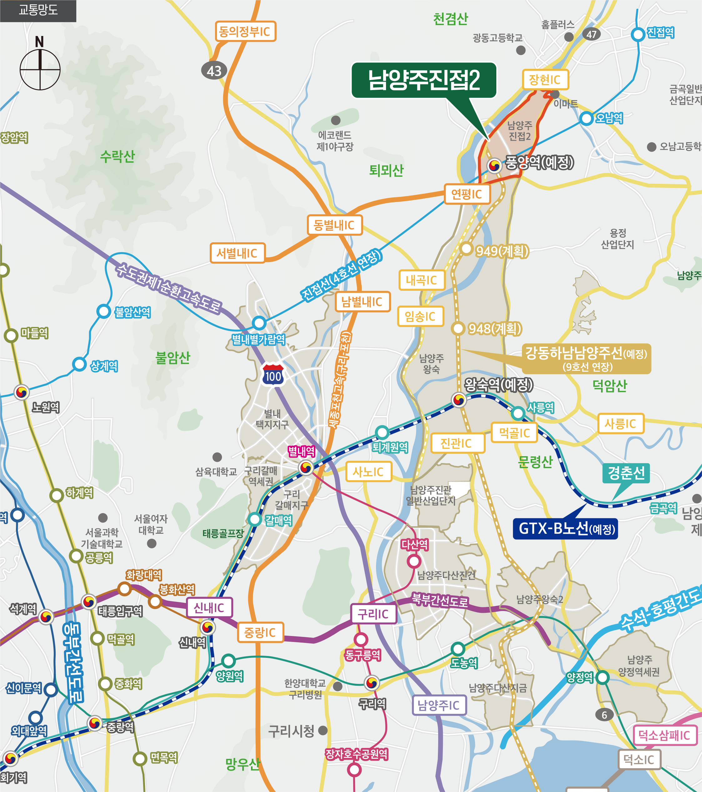 - ※ 향후 신설 예정(GTX 및 전철)인 교통망(노선 및 역사 위치)은 실제와 다를 수 있으며 변경될 수 있습니다.